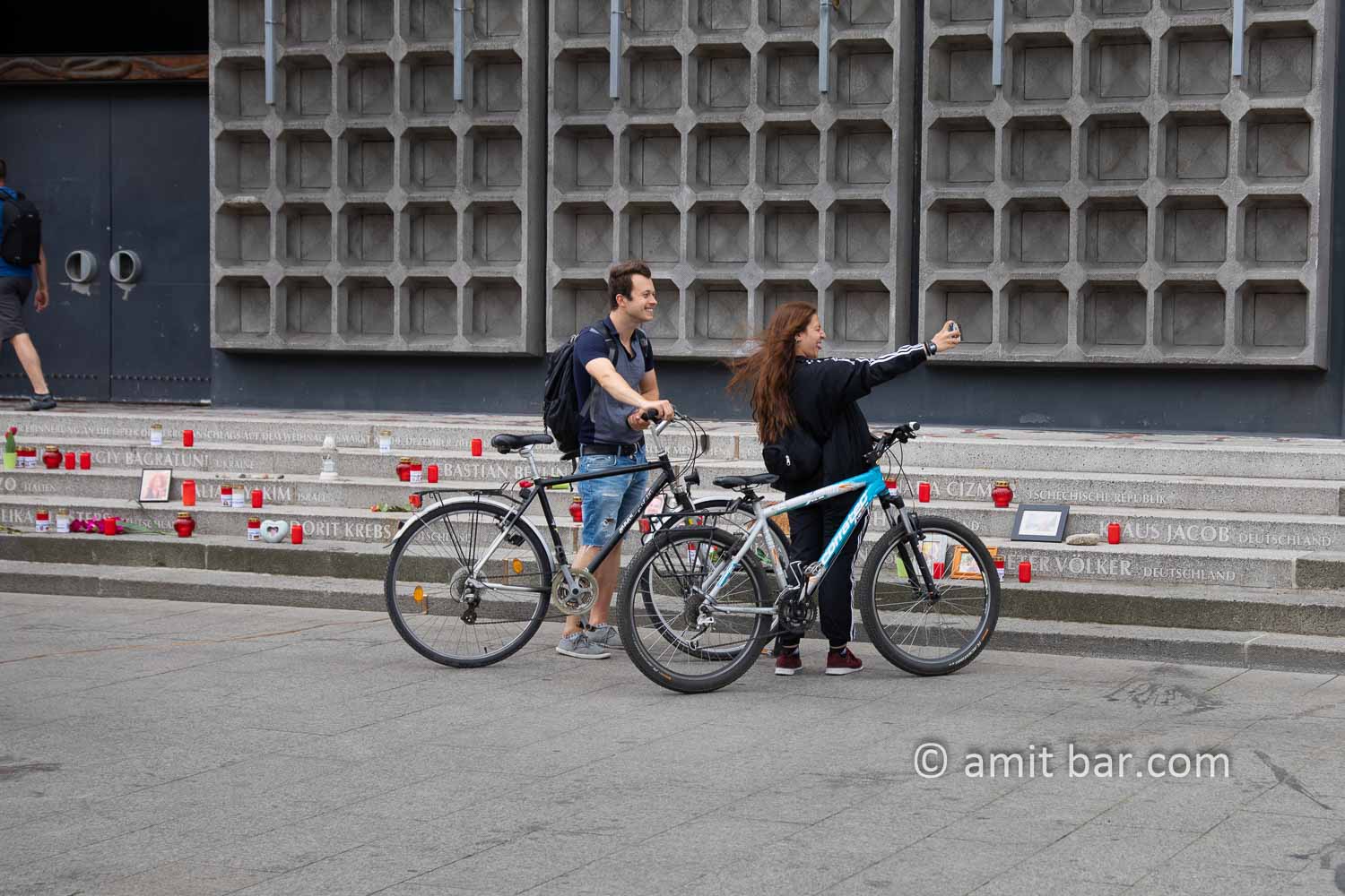 Terror selfie: Two bikers making a selfie in front of memorial monument