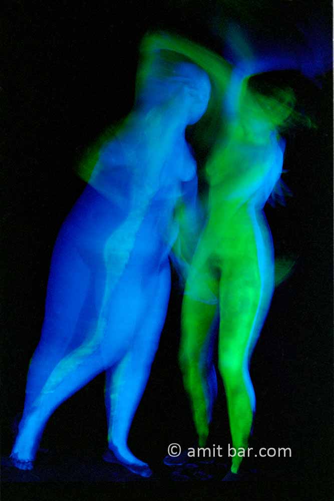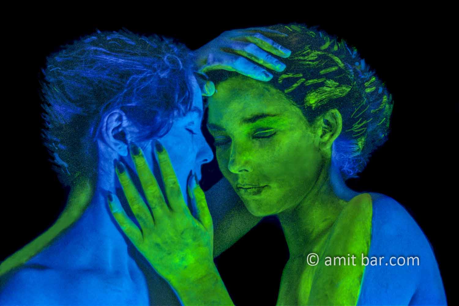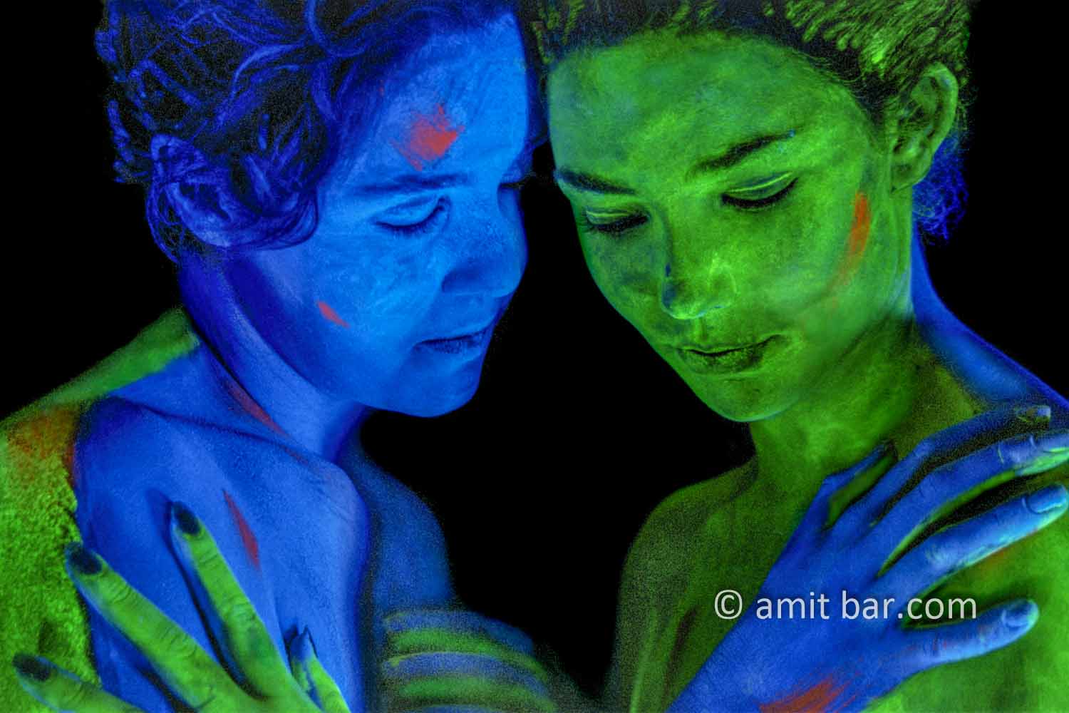 Photo 1-4: Two body-painted models in ultra-violet blue and green