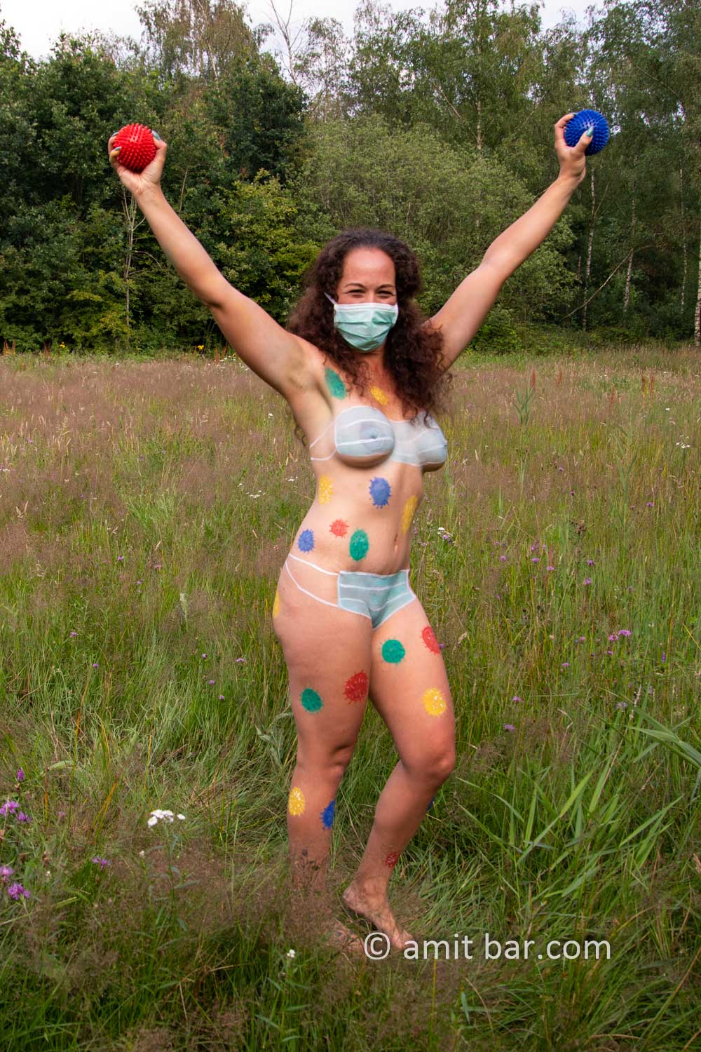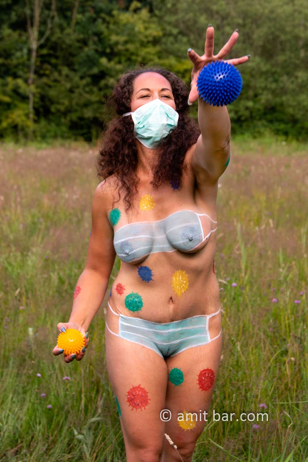 Photo I-III: Body-painted model as Corona virus victim-and fighter