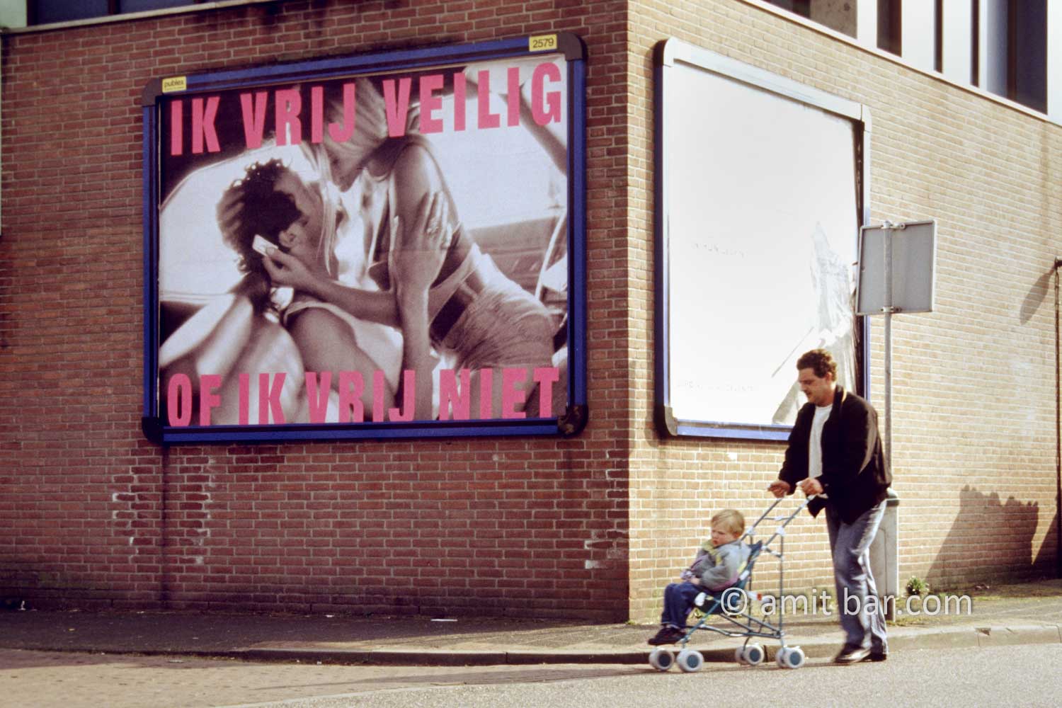 A man with his toddler in a buggy is passing besides the billboard: “I make love safely, or I don’t make love”.