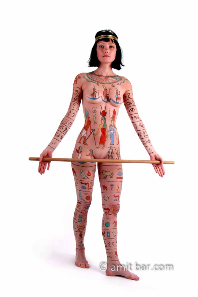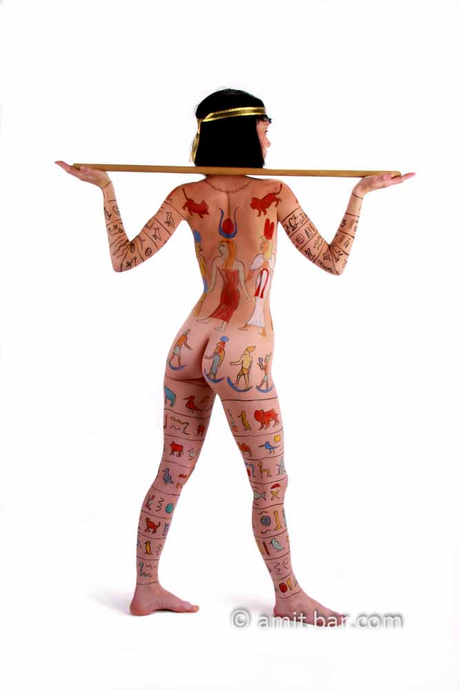 Photo 1-3: Body-painted model with Egyptian hieroglyphs