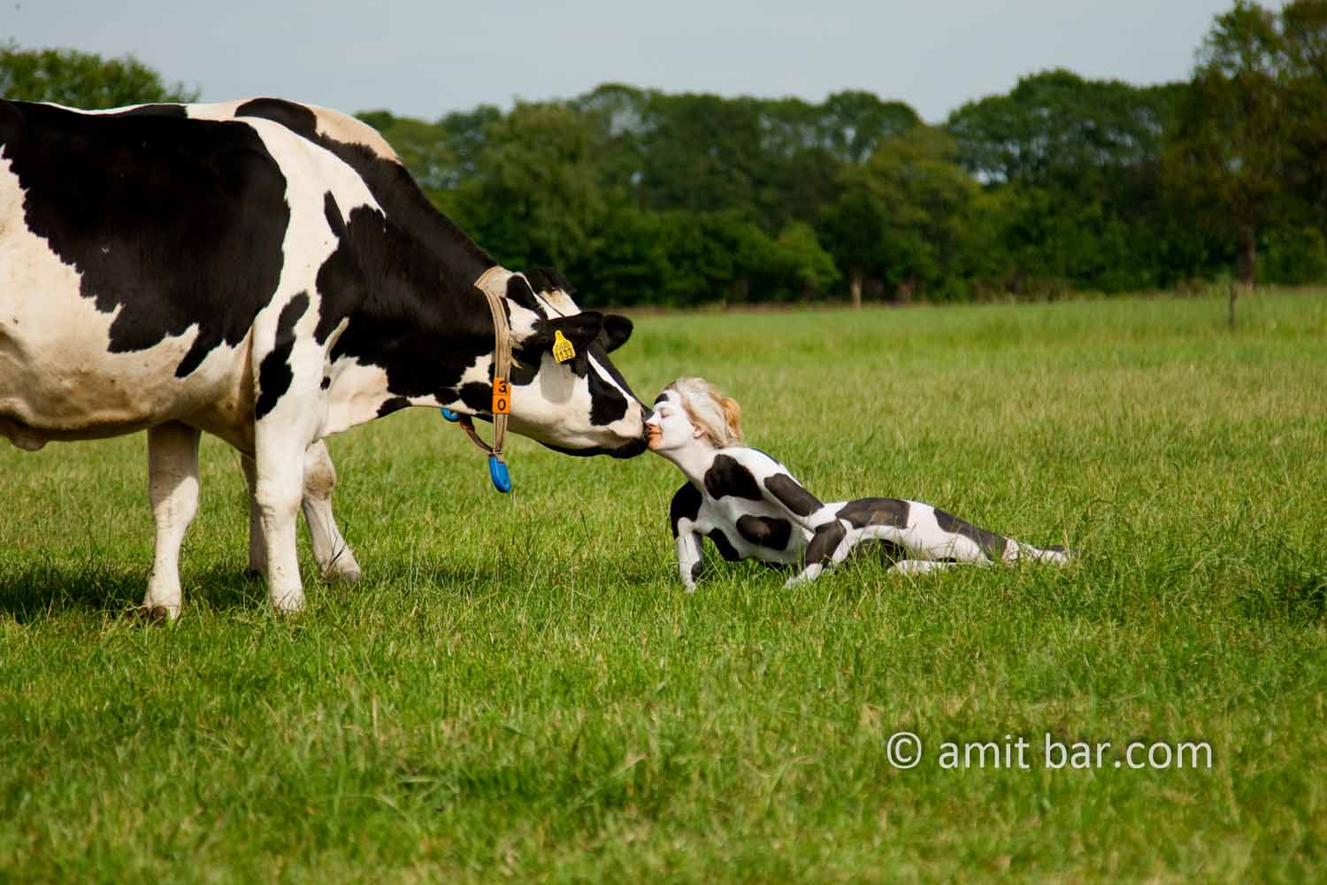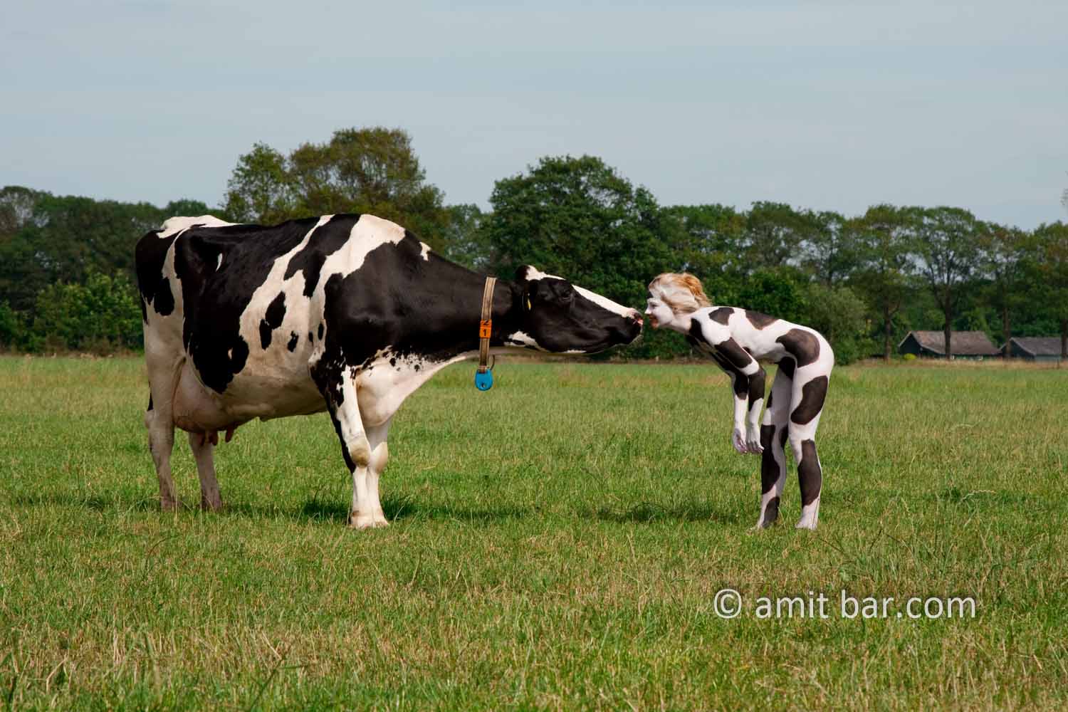 Video: Cow pattern body-painting of model in the field in early summer. Video made by TV Gelderland.