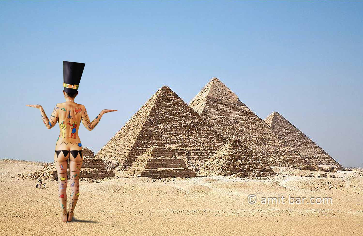 Photo III: Body-painted model as Nefertiti at the pyramides of Gizeh