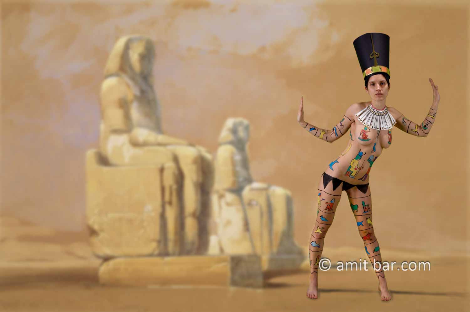 Photo IV: Body-painted model as Nefertiti at the statues of Amenhotep III in Thebe (Luxor)