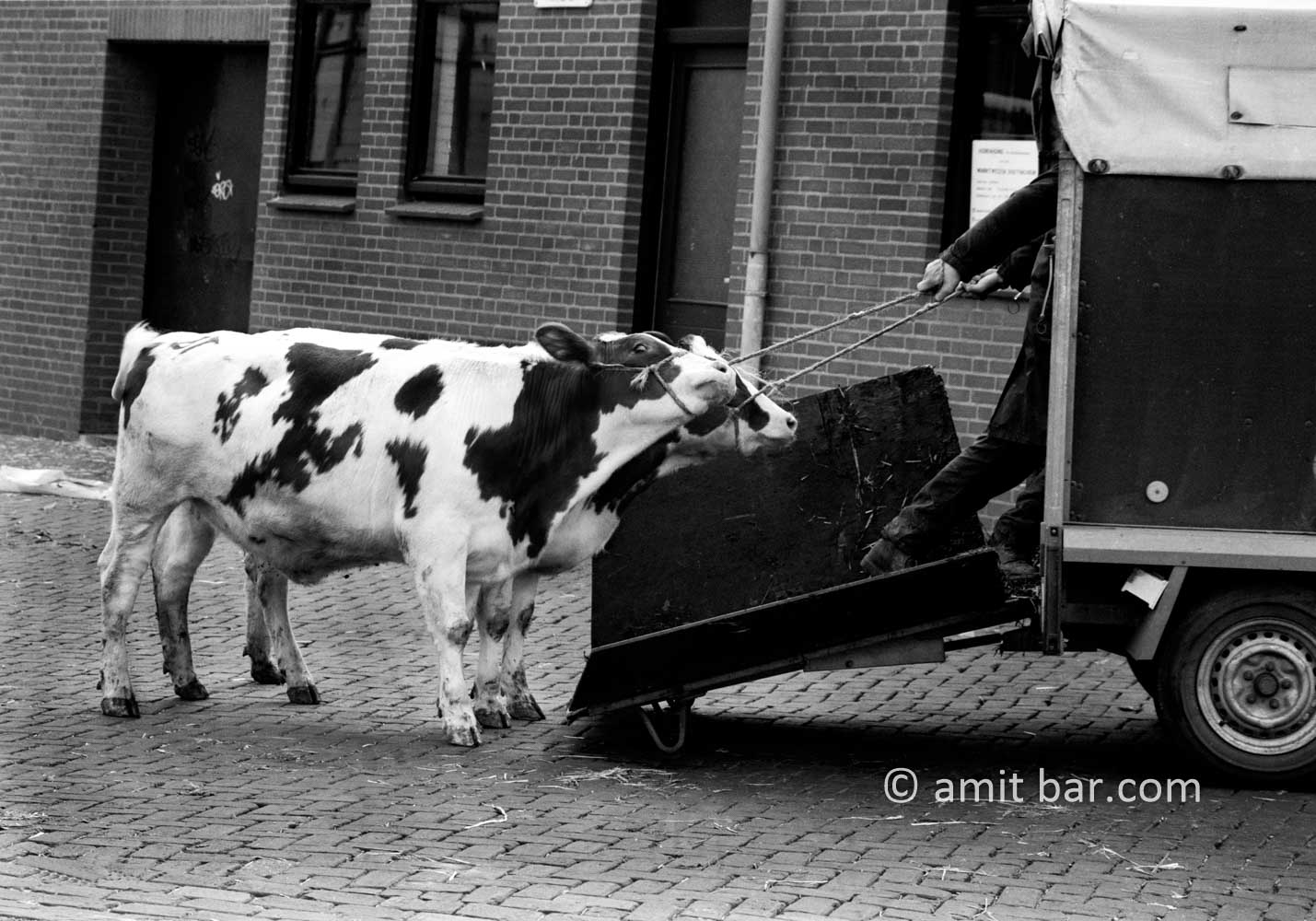 Two young cows refuse to enter the wagon of the cattle-driver. Cattle market, Doetinchem, The Netherlands