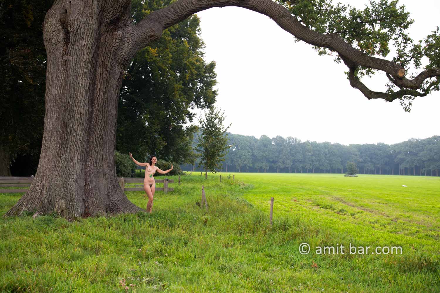 Photo 1-3: A nude model is sleeping, walking and dancing among the old oak and beech trees beside Ampsen castle, The Netherlands