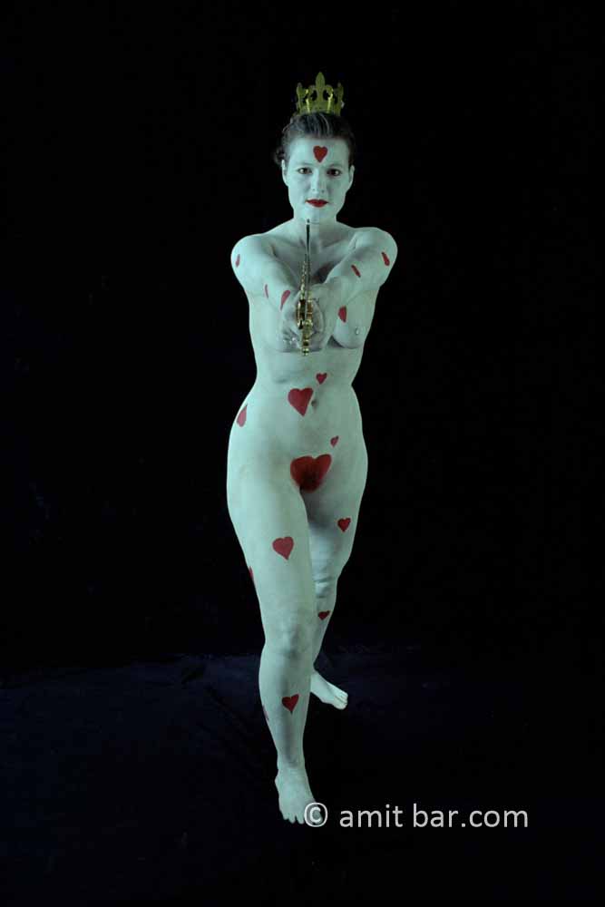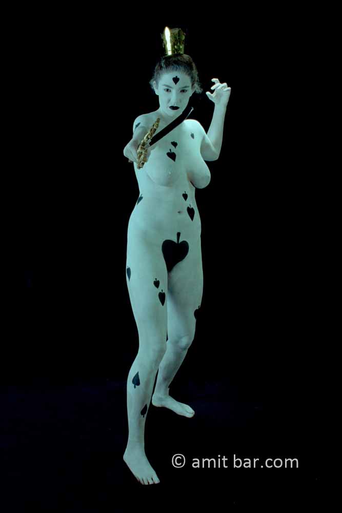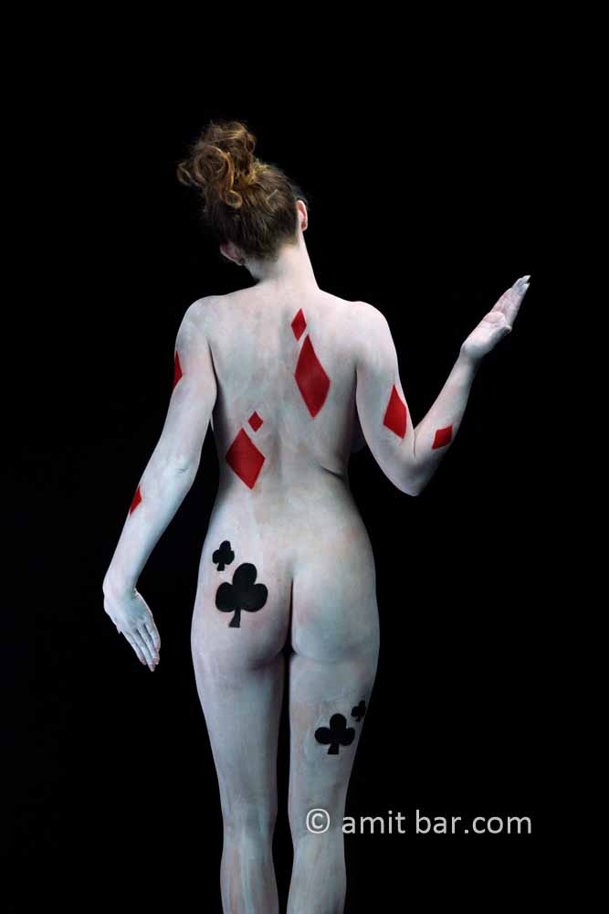 Photo 1-2: Body-painted model in card forms of clovers, diamonds, spades and hearts