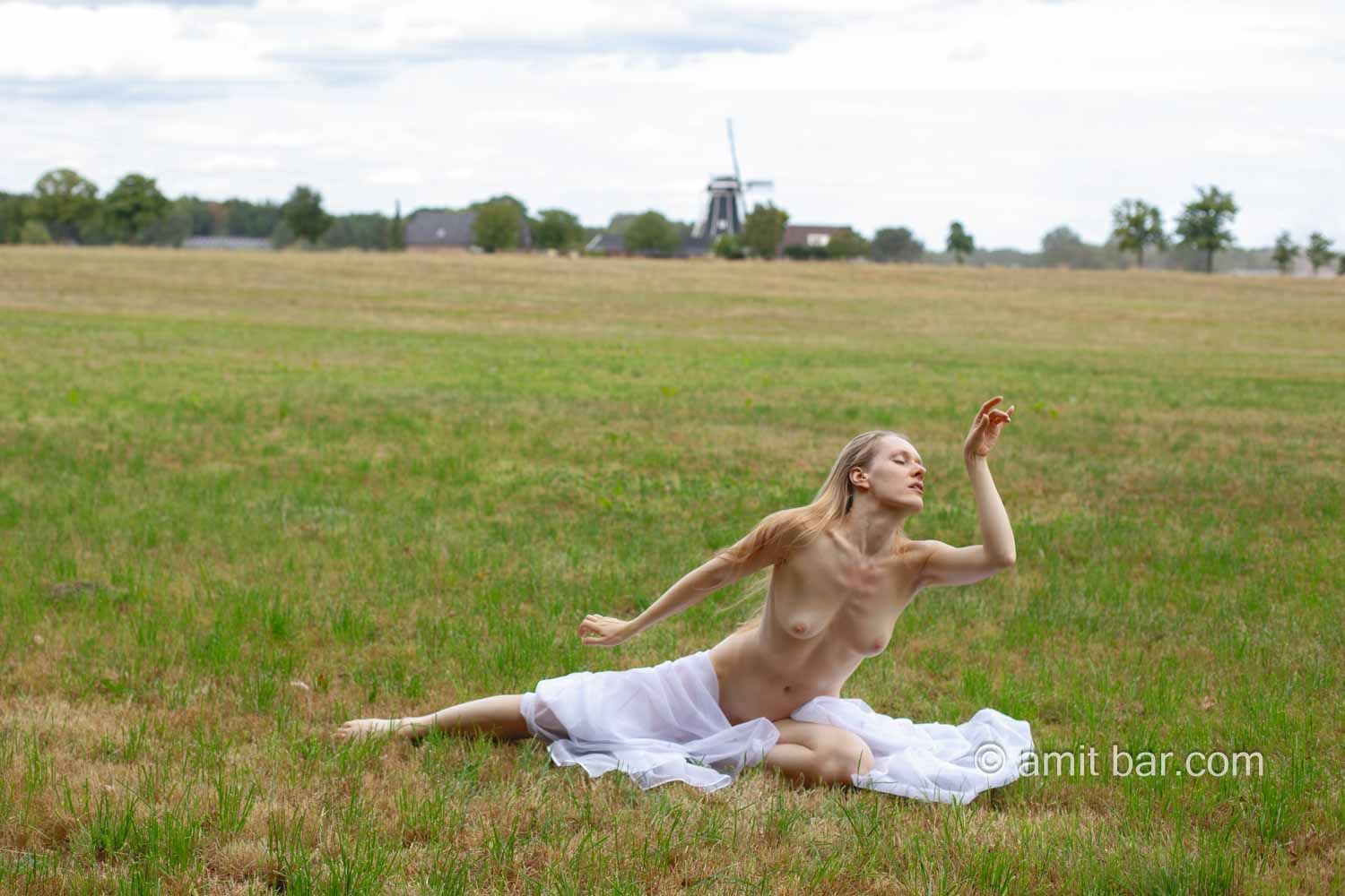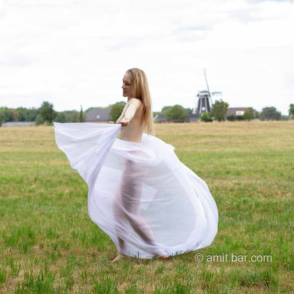 Photos & film: Model Radmila is dancing and waving with vitrage (net curtain) in the field