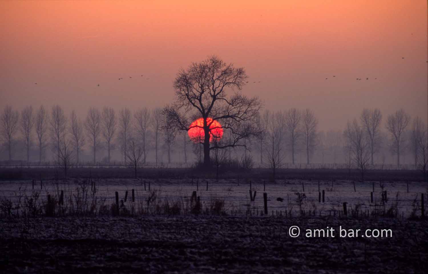 Sunset above frozen landscape at Vierakker, The Netherlands