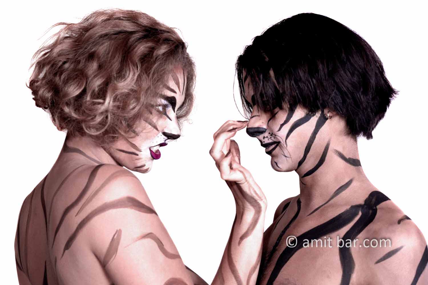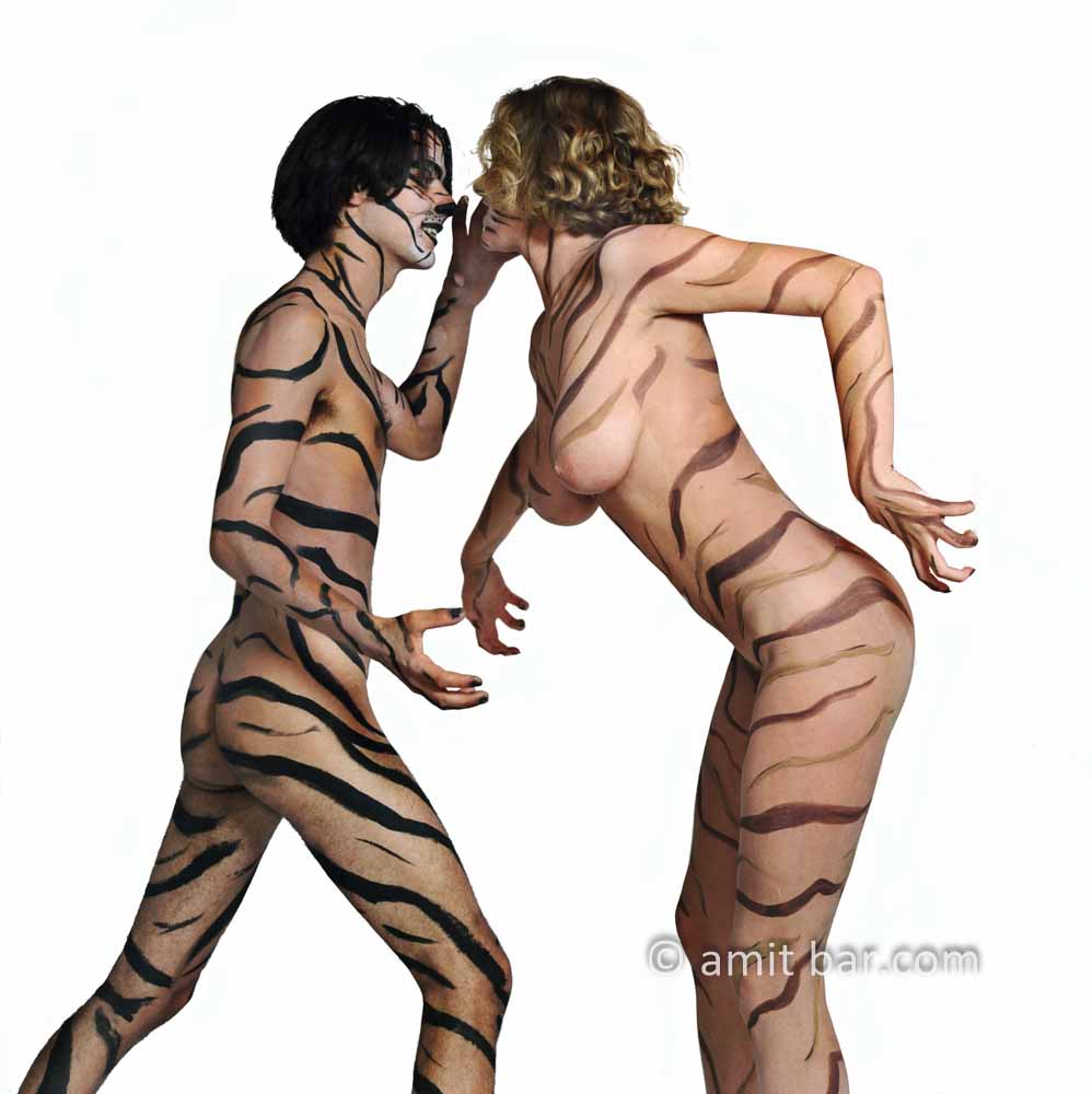 Photo 1-3: Male and female body-painted models in tigers stripes
