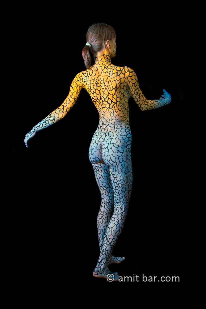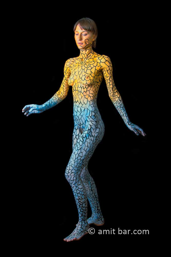 Photo 1-2: Body-painted model Dulcamara is dancing in my studio