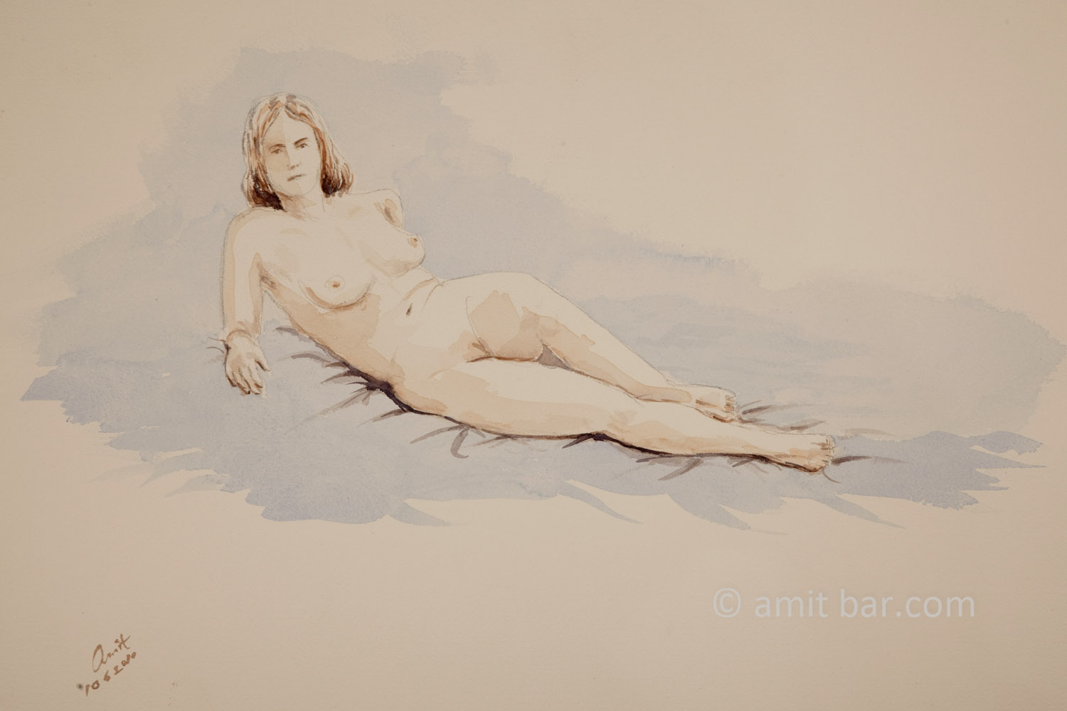 A nude model leaning on her elbows