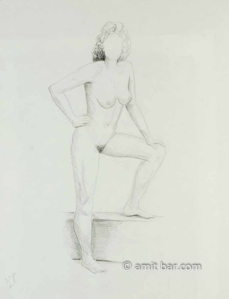 Nude figure with leg on box. Pencil drawing