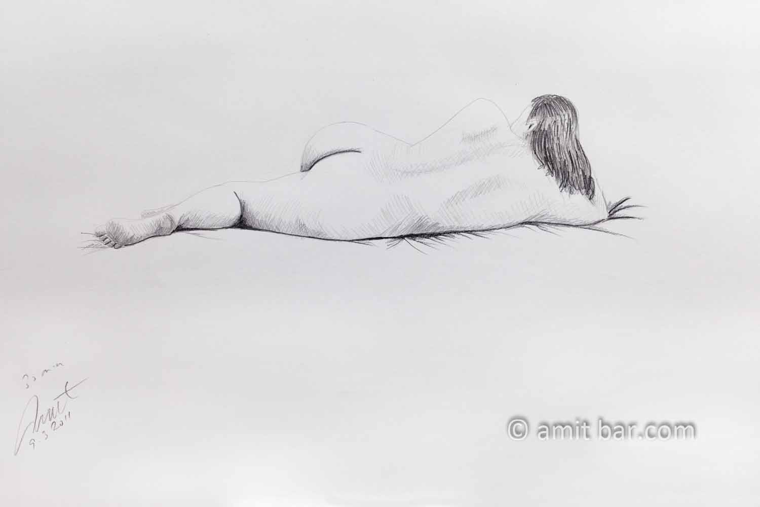 Nude model lying with left leg in front of her Nude model lying with left leg in front of her. Pencil drawing